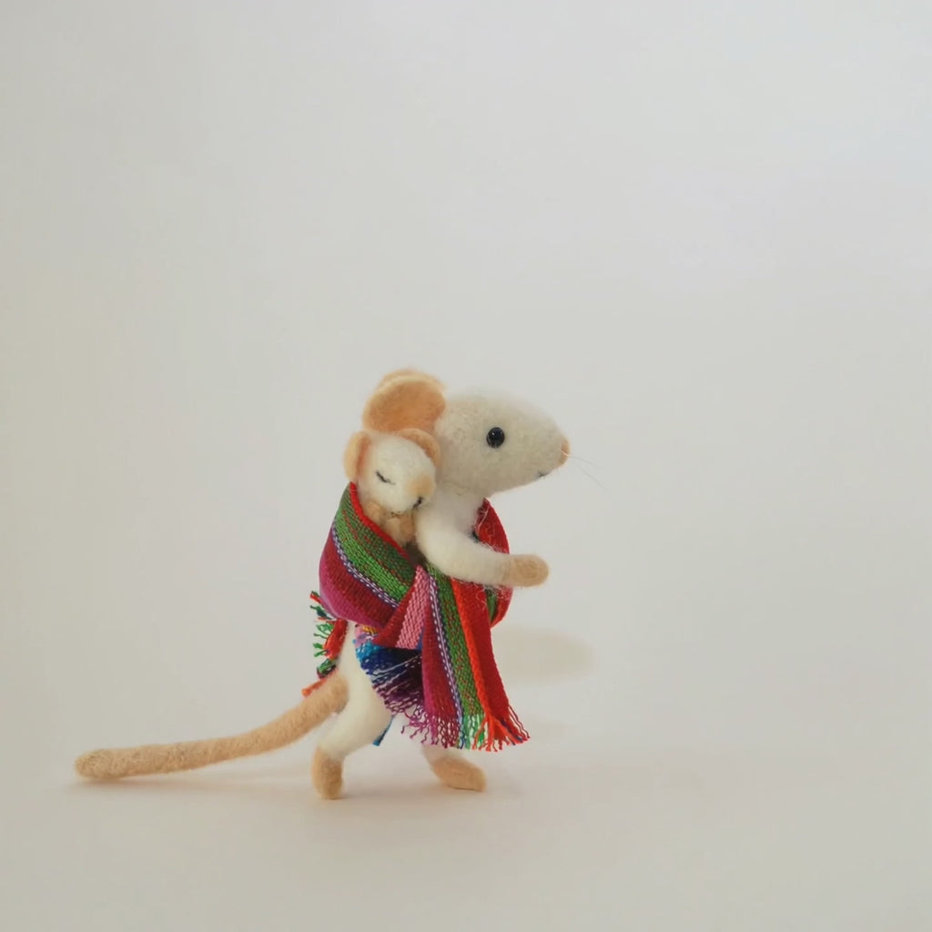 Diese Filzmaus wird von Natalia mit viel Liebe zum Detail aus Schweizer Schafwolle und Schurwolle mit der Nadel gefilzt. Dabei werden die vielen kleinen Wollhaare schön fest ineinander verhakt. Durch das Bearbeiten mit der Nadel bringt sie die Wolle in die gewünschte Form. Die Maus ist 11,5 cm gross und trägt ein Babymäuschen auf dem Rücken. Bei dieser Maus hat Natalia ein Drahtgerüst benutzt, welches anschliessend mit Wolle bedeckt wird.