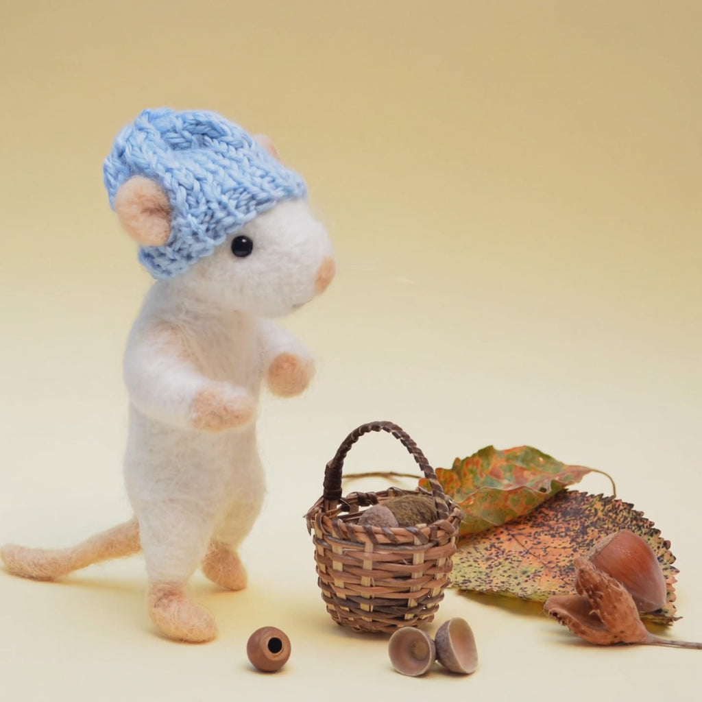 Diese Filz-Maus wird von Natalia mit viel Liebe aus Schweizer Schafwolle und Schurwolle mit der Nadel gefilzt. Dabei werden die vielen kleinen Wollhaare schön fest ineinander verhakt. Durch das Bearbeiten mit der Nadel bringt sie die Wolle in die gewünschte Form. Die Maus ist 11,5 cm gross und trägt einen Korb mit zwei nadelgefilzten Eicheln. Die gestrickte Mütze kann abgenommen werden. Bei dieser Maus hat Natalia ein Drahtgerüst benutzt, welches anschliessend mit Wolle bedeckt wird.